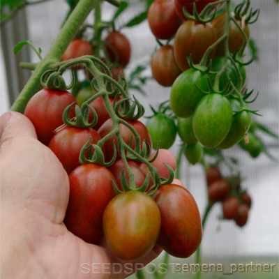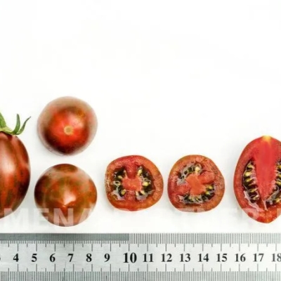 Плоды томата имеют привлекательный коричнево-вишневый цвет с болотно-зелеными штрихами и полосками. Их форма яйцевидная и удлиненная. Вес каждого плода составляет 25-30 граммов. У плода две камеры (гнезда), а количество плодов в одной кисти может достигать 20-25 штук.