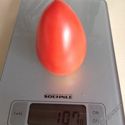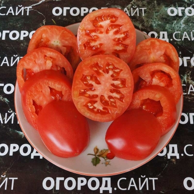 Плоды томата Долька дальневосточная характеризуются удлиненно-овальной формой, в зрелом состоянии приобретают малиновый или малиново-красный окрас. Размер плода может быть от среднего до крупного, а его масса составляет примерно 100-300 грамм.