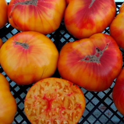 Плоды томата Двухцветный ананас имеют впечатляющие размеры: их масса варьируется от 300 до 600 граммов. Форма плодов плоскоокруглая и сплюснутая, что делает их не только вкусными, но и привлекательными внешне. Зрелые помидоры окрашены в яркий оранжевый цвет с красными румянами, что добавляет им эстетической ценности.