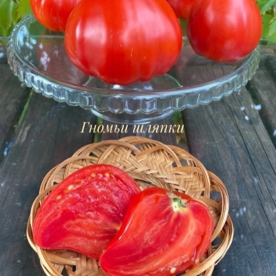 Плоды томата Гномьи шляпки имеют темно-красный цвет с глянцевой поверхностью, напоминающей лак. Это придаёт им привлекательный внешний вид и делает их желанными для потребителей. Сердцевидная форма с вытянутым носиком добавляет оригинальности каждому плоду. Масса одного помидора варьируется от 150 до 250 граммов, что делает их достаточно крупными для использования в различных кулинарных целях. Плоды отличаются плотной и мясистой мякотью с малым количеством семян, что также является важным качеством для многих садоводов.