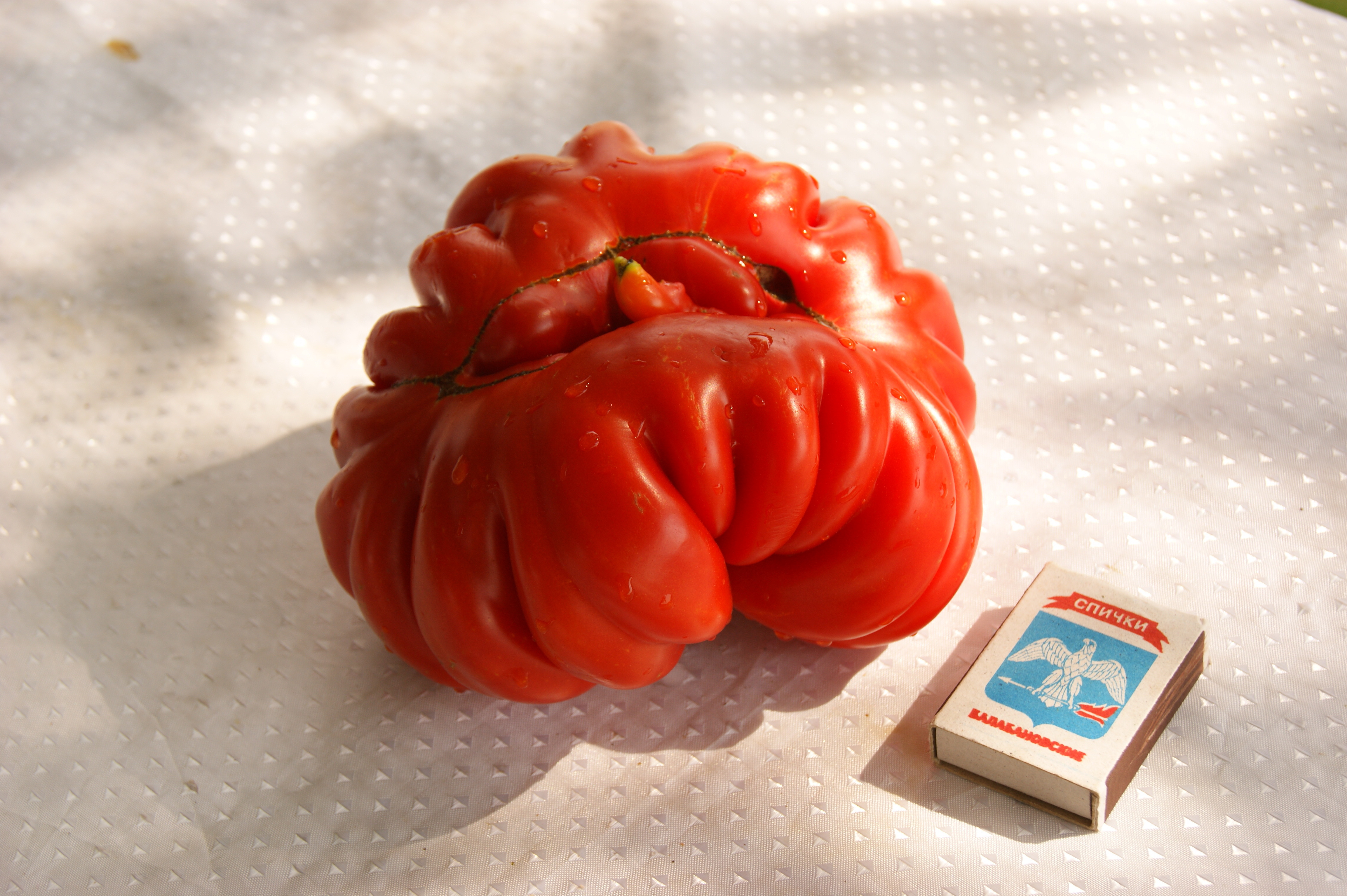 Форма помидор очень необычная, эффектная. Они сплюснуты сверху и снизу и сильноребристые – «гофрированные», все состоят из складочек, будто собраны из отдельных долек.