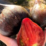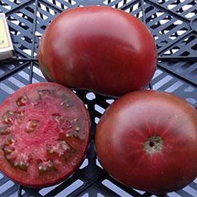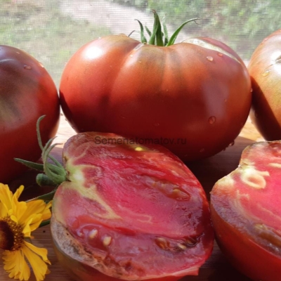 Плоды крупного размера (от 200 до 300 граммов), плоскоокруглой формы, при созревании имеют бордово-коричневый цвет. Мякоть мясистая и сочная, в разрезе похожа на мякоть арбуза. Кожица тонкая, нежная.