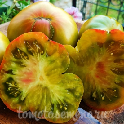 Плоды томата Козула 20 обладают яркими качествами. Они имеют плоскоокруглую форму и могут варьироваться по цвету от зеленого до красного. Масса одного плода составляет от 200 до 300 граммов, однако отдельные экземпляры могут достигать веса до 400-500 граммов. Мякоть этих томатов отличается сочностью и мясистостью; она плотная и содержит небольшое количество семян. Цвет мякоти оливковый с красными разводами по центру.