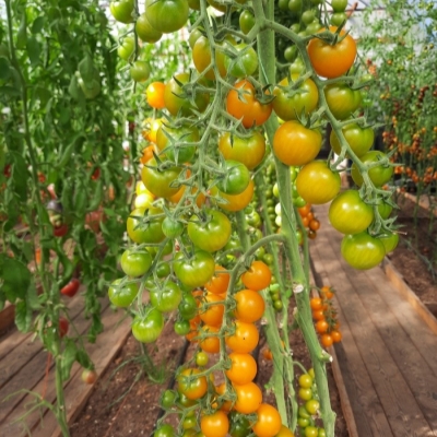 Плоды томата Летнее солнце имеют округлую форму и яркий янтарный цвет при зрелости. Масса каждого плода составляет от 20 до 30 граммов, что делает их удобными для использования в различных кулинарных целях. Благодаря своей устойчивости к растрескиванию плодов они сохраняют привлекательный внешний вид даже при неблагоприятных погодных условиях.