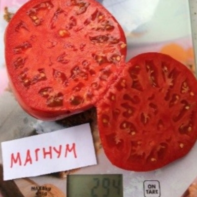 Плоды томата Магнум обладают округло-плоской формой и могут весить от 300 до 500 граммов. Рекордные экземпляры достигают массы до 1000 граммов. Кожица плодов плотная, что позволяет им хорошо сохраняться при транспортировке и хранении. Мякоть томатов мясистая и плотная, с малым количеством семян, что делает их идеальными для приготовления различных блюд: от салатов до соусов.
