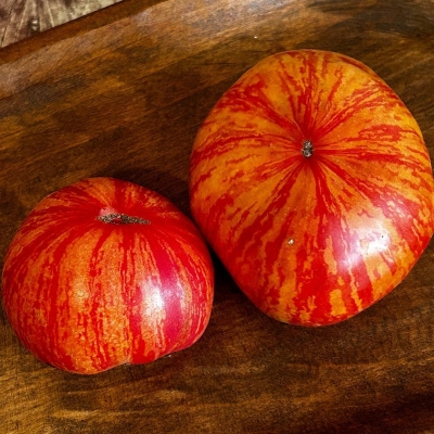 Плоды томата Пикассо обладают привлекательным внешним видом: они округлой формы с легким приплющиванием и имеют малиновый цвет с изящной золотистой росписью. Средняя масса одного плода колеблется от 250 до 300 граммов, что делает их достаточно крупными по сравнению с другими сортами. Урожайность данного сорта впечатляет — можно собрать до 5–7 кг с куста.