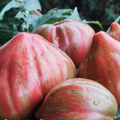 Плоды томата Пурпурный Дождь имеют бордово-сиреневый цвет с почти металлическими зелеными полосками и разводами. Это делает их особенно привлекательными на вид. Средняя масса одного плода составляет от 200 до 300 граммов, а форма — сердцевидная. В кисти обычно образуется от 3 до 5 плодов, что способствует увеличению общей урожайности куста.