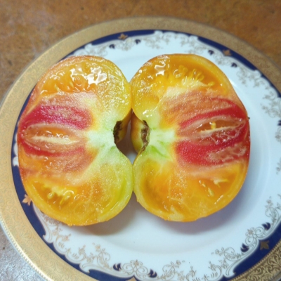 Плоды томата Сказочный фрукт имеют яркий жёлто-оранжевый цвет с малиновыми румянами, что придаёт им привлекательный внешний вид. Они обладают плоскоокруглой формой с тупоносым или сердцевидным контуром. Средняя масса одного плода колеблется от 300 до 500 граммов, что делает их достаточно крупными и заметными на фоне других сортов.