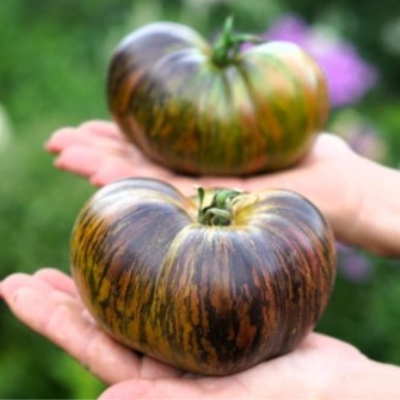 Плоды томата Триумф Софии имеют изумрудный цвет с яркими узорами малинового, красного и желтого оттенков. Они обладают высокоплоскоокруглой формой с характерным «клювиком». Масса одного плода варьируется от 200 до 500 граммов, что делает их достаточно крупными и заметными на кусте.