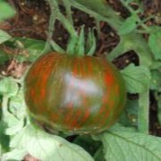 Невызревшие плоды окрашены в зеленый цвет. Они обладают выраженным пятном темно-зеленого цвета у плодоножки. По мере созревания плоды окрашиваются в бурый, темно-красный или коричневый оттенки. Встречаются томаты с темно-фиолетовым отливом или красными пятнами. В весе томаты набирают до 108 граммов. Форма у них круглая, немного приплюснутая, с небольшой ребристостью.