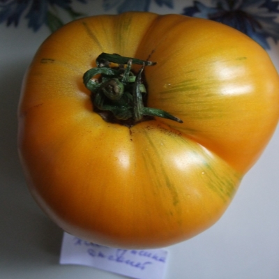 Плоды крупные, увесистые, плоскоокруглой формы. Вес томатов в среднем от 300 до 500 г. Встречаются и более увесистые плоды по 600-800 г. Созревают такие овощи самыми первыми и только один раз.