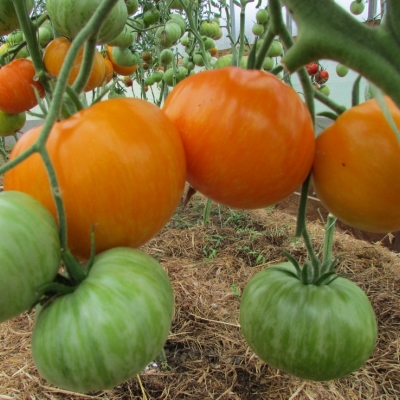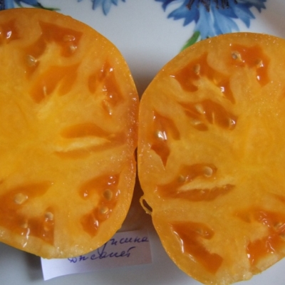 Цвет помидоров очень интересный. Кожица приятного оранжевого окраса с тоненькими светлыми продольными полосками. Полоски могут быть непрерывными или в виде штрихов.
