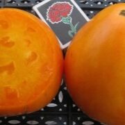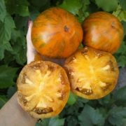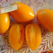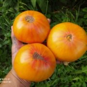 Цвет помидоров очень интересный. Кожица приятного оранжевого окраса с тоненькими светлыми продольными полосками. Полоски могут быть непрерывными или в виде штрихов.