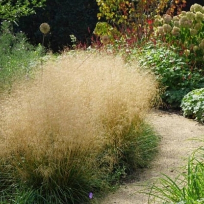 Растение достигает высоты около 60 см и имеет ширину примерно 60 см. Листья тонкие и длинные, темно-зеленые с бронзовым оттенком. Соцветия представлены метёлками золотистого цвета, которые осенью приобретают соломенно-золотистую окраску. Луговик создает привлекательный вид в саду и становится настоящим его украшением.