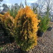 «Гельдерлэнд». Этот сорт обладает миниатюрной хвоей-хамелеоном. Крона взрослых посадок в ширину может достигать до 2-2,5 м, форма у нее конусовидная. Высота каждого такого растения равна примерно 4-4,5 м. Ежегодный прирост составляет около 15-20 сантиметров. Летом хвоя интенсивного зеленого окраса, но с наступлением холодов она приобретает яркую желтую расцветку. Данный сорт можно вырастить даже на бедной почве. Высаживать эти туи допустимо как на солнце, так и в тени. В жаркое время иголки не станут выгорать.