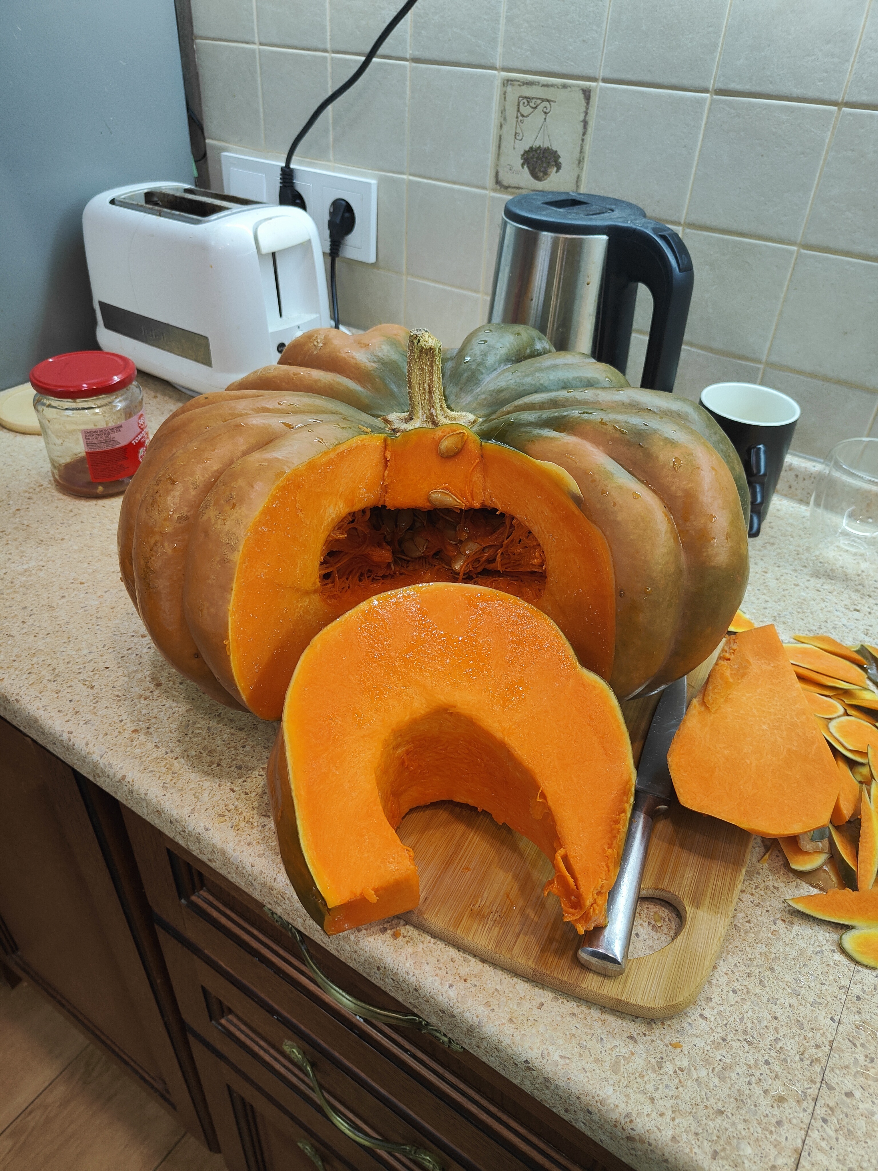 Преимущества: Выращиваю тыкву рассадным способом. Посадил 1 корень этой тыкву в конце мая. Возраст рассады 3 недели. За тыквой особо не ухаживал, росла в полутени. Лето было дождливое, ни разу не поливал тыкву. Тыква очень разрослась. Очень не прихотливая. Убрал в конце сентября перед заморозками. Выросло 5 больших тыкв от 9 до 12 кг. По виду не дозрели, были зелёные. Только к середине ноября приобрели оранжевый цвет. Запах тыквы дынный, в меру сладкая.