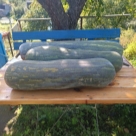 Комментарий: Массу тыкв пока не знаю, сегодня (16 октября) только собрала с грядки, но еле их подняла, длина около 75см. Рядом на фото тыквы "Матильда". Пусть полежат немного, потом будет дегустация.