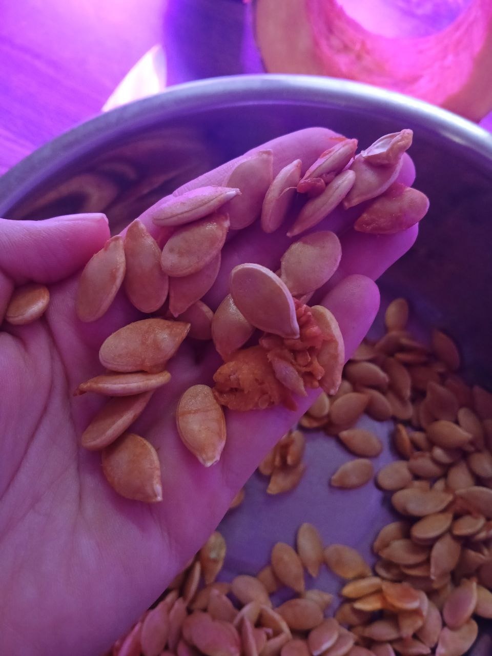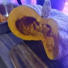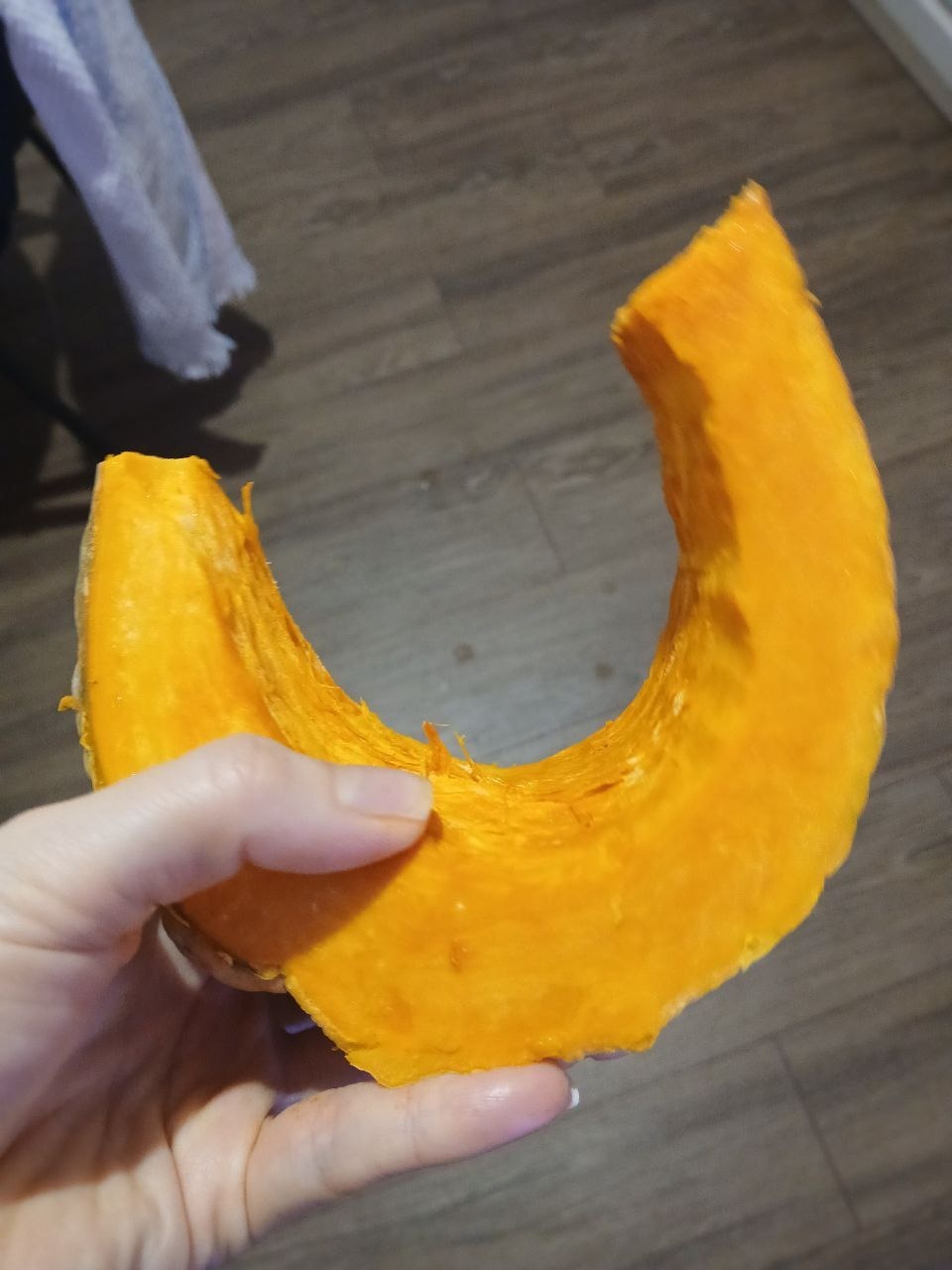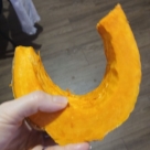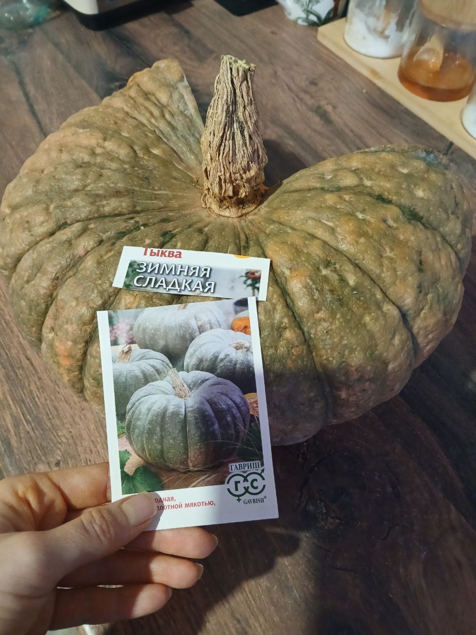 Комментарий: Визуально выглядит так себе... Начала резать, побоявшись что портится, ибо за время лежания она оч сильно посветлела, выцвела, местами серо-зеленая, в каких-то пигментных пятнах. Режется ещё хуже чем выглядит. Почистить ножичком невозможно. Только рубить околотесаковым ножом, обтесывая вместе с задревеневшей неровной корой и так не толстую мякоть. Семечки толстые, очень твердокорые. Сложно понять, можно ли такие употреблять без щелкунчика. Как орехи, ей богу. Ну ты, тыква, капец с жестким всем. Корой, семками, твёрдой мякотью, и, вероятно, характером. Но, попробовав на вкус, я ей простила всё. Это один сплошной ароматный сахарный цукат. Можно резать кубиками и точить сырой. Обалденная. Низкий селекционерам поклон.