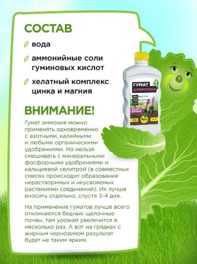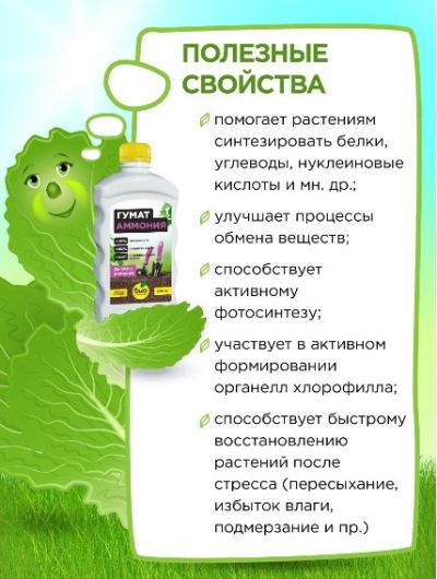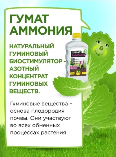 В гумате аммония повышена концентрация азота в легкорастворимой форме (то есть в виде аммония). Это важный состав для растений на раннем этапе их развития: при подготовке семенного материала, для подкормки рассады, для ее пикировки, а также для первой пересадки.