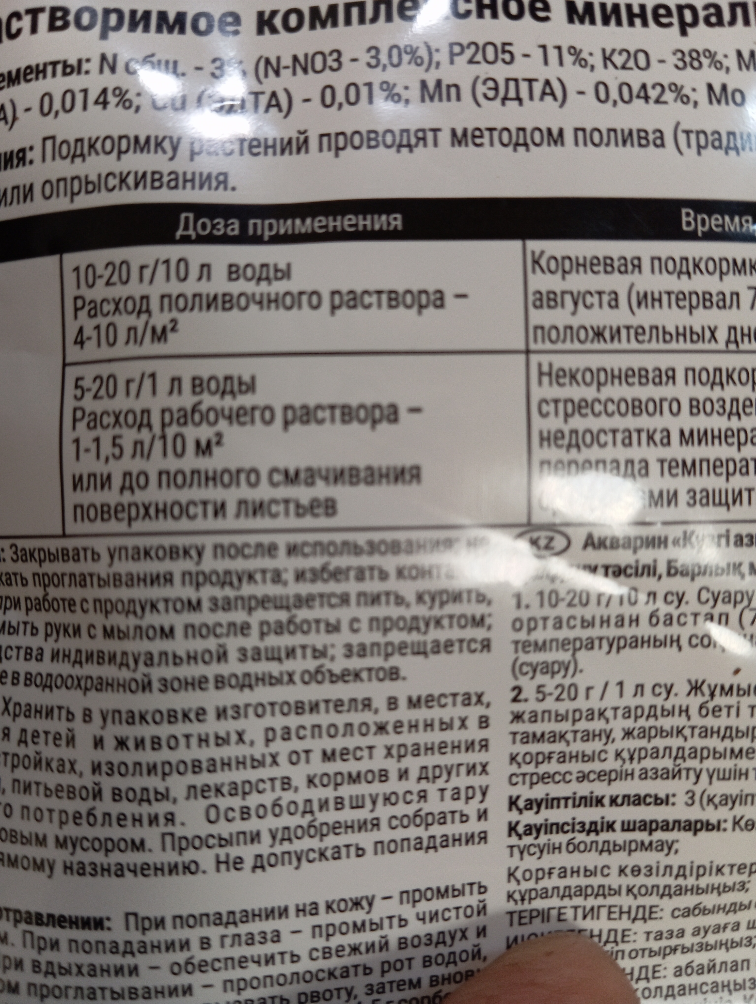Комментарий: загубил астры, капусту, огурцы, сильно пострадали томаты, стойко перенесли только перцы и то наблюдалась ломкость листьев при подкормке раз в неделю 1,5 г на 1,5 литра