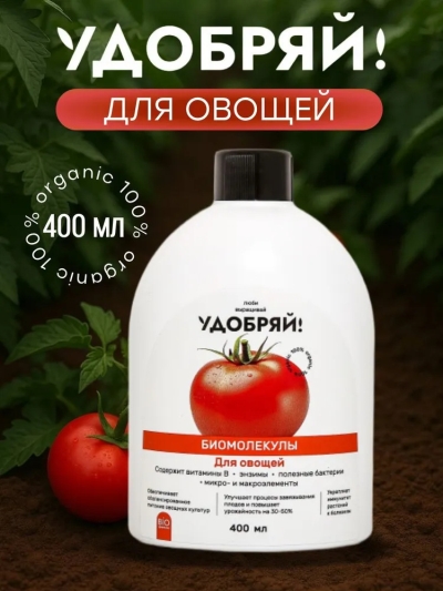 Удобрение Биомолекулы Удобряй представляет собой инновационный комплекс питательных элементов, который обеспечивает оптимальное доступное питание на молекулярном уровне на всех этапах развития растений. Это водорастворимое удобрение в жидкой форме разработано с учетом потребностей различных овощных культур и подходит для использования как в саду, так и на огороде.