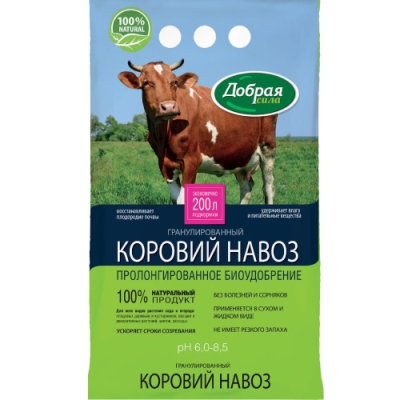 Удобрение Добрая Сила Коровий навоз — это гранулированное биоудобрение на основе натурального коровьего навоза, произведённое по современным технологиям. Средство обладает пролонгированным действием и предназначено для естественного восстановления и повышения плодородия почвы. В составе содержатся органические вещества (72,7%), гуминовые кислоты (6,6%), фульвовые кислоты (12,5%), а также минеральные элементы: азот — 0,7%, фосфор (P₂O₅) — 0,7%, калий (K₂O) — 1,3%. Удобрение также обогащено микроэлементами (медь, цинк, марганец) в легкоусвояемой форме.