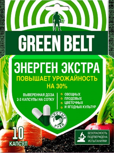 Энерген Экстра Грин Бэлт (также известен как Энерген Extra) — это природный органоминеральный стимулятор роста и развития растений в форме капсул. Основа препарата — калиевые соли гуминовых кислот (не менее 850 г/кг), обладающие выраженным стимулирующим действием. Препарат полностью водорастворим, безопасен, подходит для применения в открытом и защищённом грунте, универсален для всех видов садовых, огородных и цветочных культур.