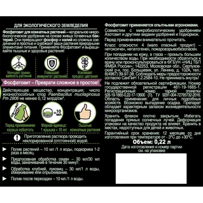 «Фосфатовит» способствует оздоровлению плодородного слоя почвы за счет того, что полезные бактерии борются с фитопатогенами. Это улучшает состояние почвы и способствует ее обогащению полезными микроорганизмами.