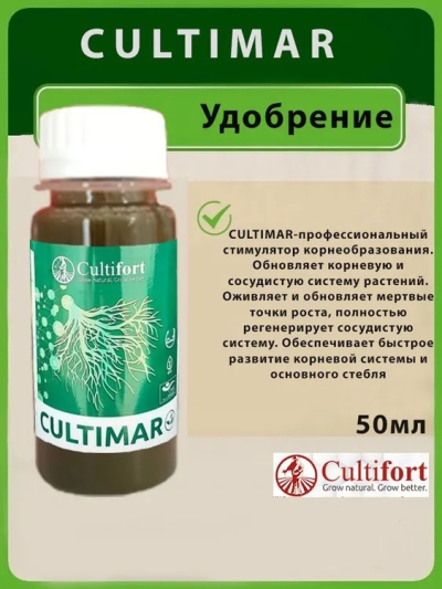 Удобрение Культимар представляет собой органоминеральное удобрение специального действия. Препарат производства испанского бренда Cultifort предназначается для поддержания растений в наиболее сложные периоды развития – от адаптации на новом месте до плодоношения. В составе средства главенствующую роль играют морские водоросли, на которые приходится до 74%. Они содержат эфирные масла, витамины, сахара, белки, минеральные соли и альгиновую кислоту. Кроме того, в значительных количествах присутствуют бор – до 20% и окись магния – около 3%. Встречаются также среди составляющих аминокислоты, генные гормоны и витамины A, C, E.