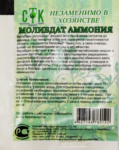 - Общая характеристика : микроэлементное удобрение для компенсации недостатка молибдена, улучшения усвоения азота и повышения урожайности растений