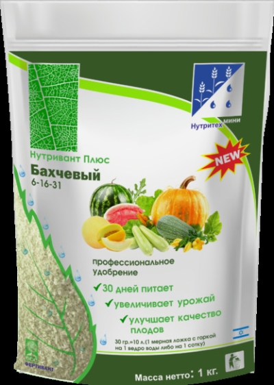 Нутривант Плюс Бахчевый (6-16-31) является минеральным удобрением, предназначенным специально для подкормки бахчевых культур. Оно имеет форму кристаллов и легко растворяется в воде. Удобрение содержит азот, фосфор, калий, магний, бор, марганец, цинк, медь, железо и молибден. Компоненты удобрения способствуют активизации роста и полноценному развитию растений.