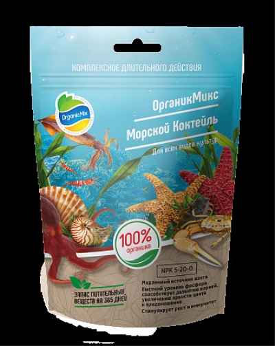 Комплексное удобрение под названием Морской коктейль от бренда Органик Микс обеспечивает растения всеми необходимыми элементами. Дополнительным плюсом считается улучшение состояния грунта.