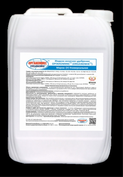 Органомикс Универсальное — это жидкое хелатное удобрение премиум-класса, разработанное для внекорневой подкормки широкого спектра сельскохозяйственных культур. Препарат сочетает в себе комплекс макро- и микроэлементов, природный антиоксидант дегидрокверцетин (ДГК), а также фитогормон ауксин, что обеспечивает стимулирующее, антистрессовое, иммуномодулирующее и фунгицидное действие.