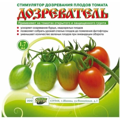 Ортон Дозреватель для томатов — жидкий стимулятор дозревания, предназначенный для ускоренного вызревания плодов томата, а также перца и баклажана. Препарат содержит активное вещество — 2-хлорэтилфосфоновую кислоту в концентрации 629 г/л.