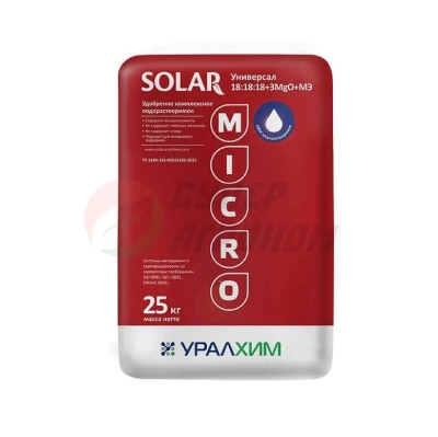 Солар Универсал 18: 18: 18+МЭ — это комплексное водорастворимое удобрение от компании УралХим, предназначенное для полноценного питания растений на всех стадиях роста. Препарат обладает сбалансированным содержанием азота, фосфора и калия (по 18%) и дополнен магнием, серой, а также набором микроэлементов в хелатной форме (EDTA), включая железо, марганец, цинк, медь, бор и молибден.