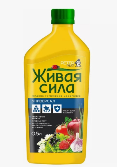 Живая сила Универсал от бренда Peter Peat — это универсальное гуминовое удобрение в жидкой форме, предназначенное для полноценного питания любых видов культур. Основу состава составляет комплекс гуминовых кислот (20 г/л), дополненный макроэлементами: азотом (N), фосфором (P₂O₅ — 11 г/л) и калием (K₂O — 12 г/л).