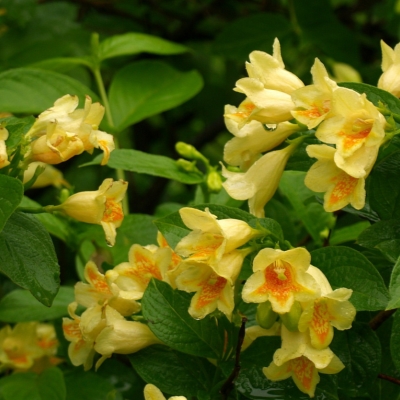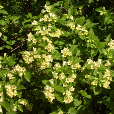 Листопадные высокорослые кусты около 100-120 см высотой и 120 см диаметром, округлые и шаровидные, с восходящими побегами, на которых располагаются сидячие, заостренно-овальные зеленые листья. Цветки распускаются в соцветии по 2-6 штук, они крупные (3,5-4 см) и имеют колокольчато-воронковидную форму. Окраска – нежная, бледно-желтая, аромат слабый.