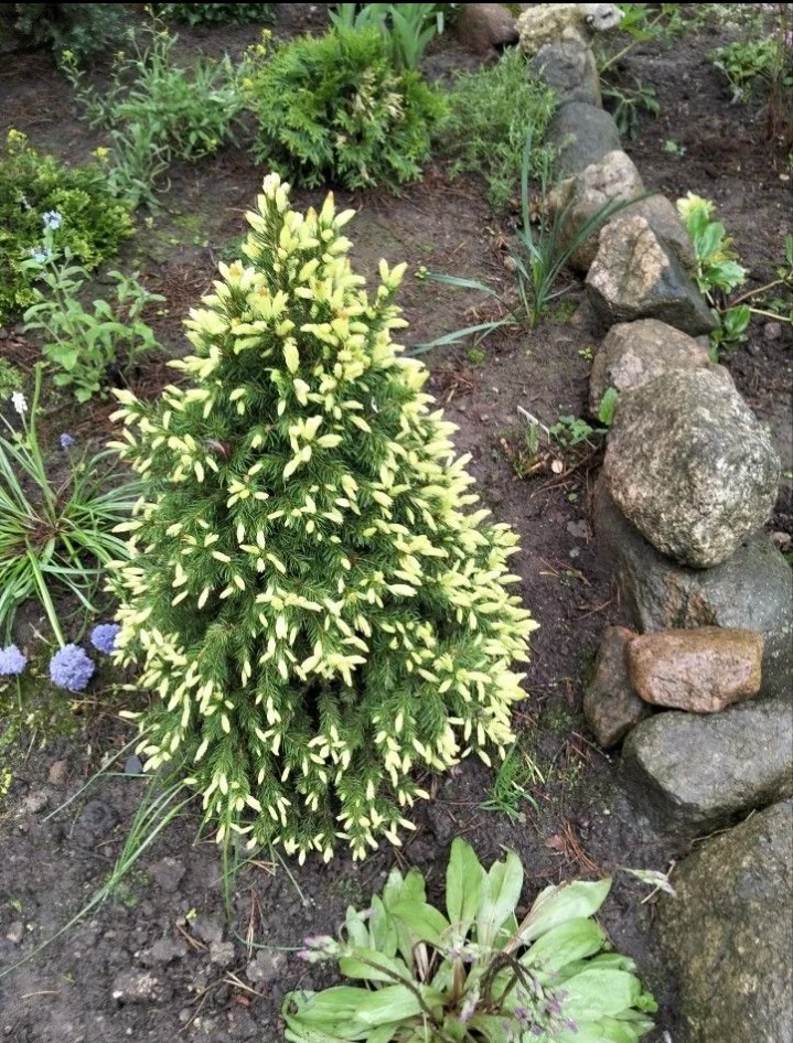 Канадские ели благодаря пестрой окраске очень эффектно оттеняются яркими цветочными посадками. Такое сочетание растений выглядит очень гармонично, дает возможность необычно оформить цветник или украсить входную группу на участке. Миниатюрный сорт Daisy» s White пригоден и для контейнерного выращивания, но в открытом грунте ей требуется гораздо меньше внимания и заботы.