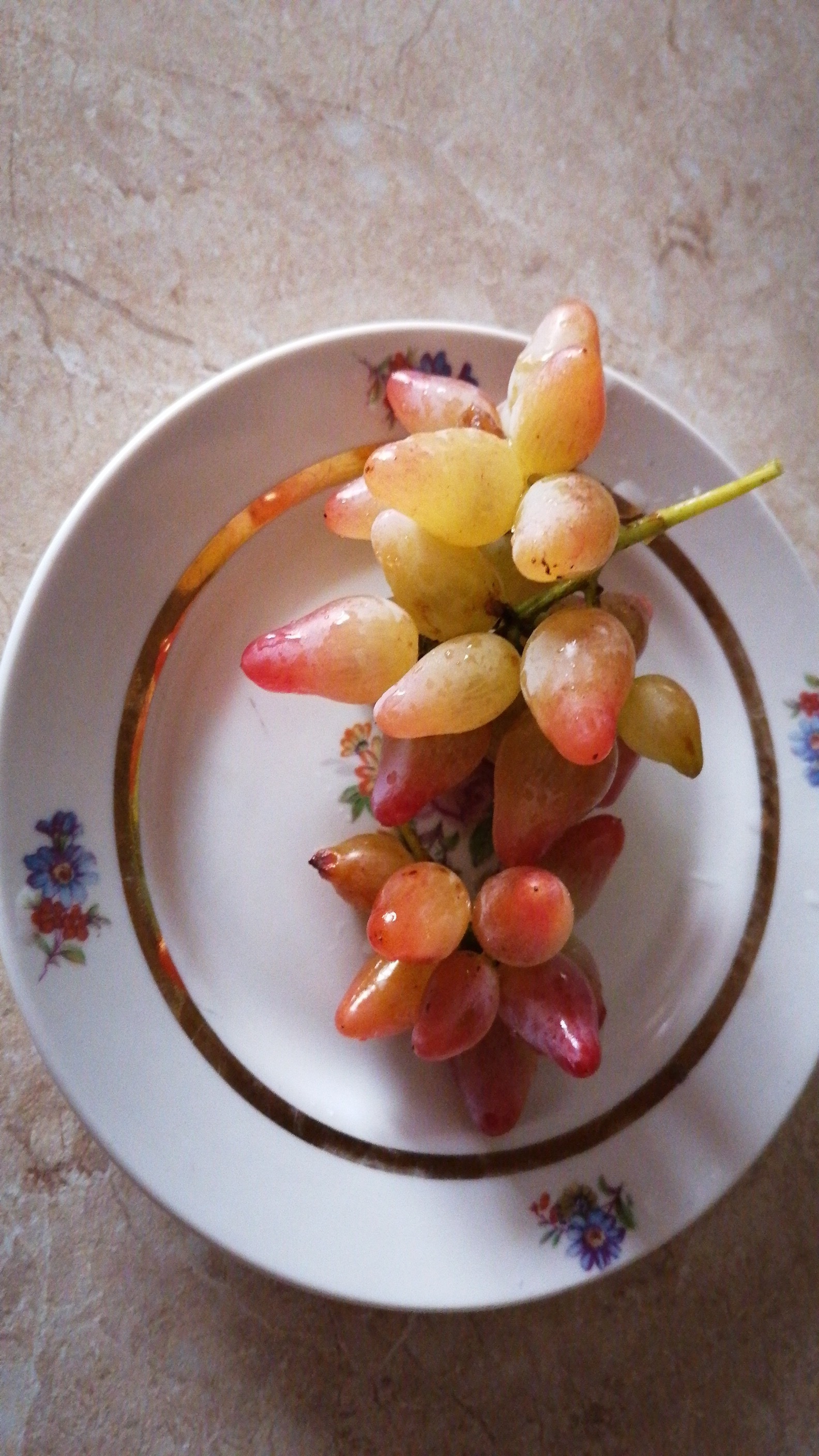 Плоды могут быть как белыми, так и бело-розовыми. Косточки есть, на каждую виноградину их от 2-х до 3-х.