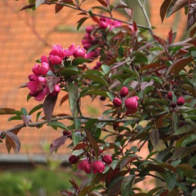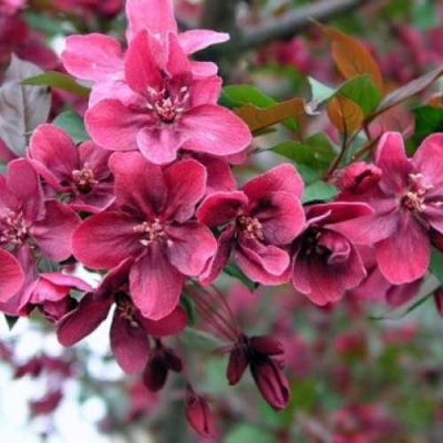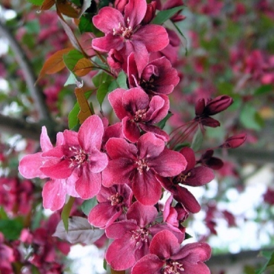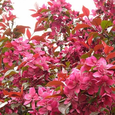 Культура обладает уникальными декоративными характеристиками. Она прекрасно выглядит круглый год. Весенний длительный и обильный период цветения радует розовыми соцветиями. Затем дерево сменяет окрас листьев на изумительный пурпурный, сохраняя его вплоть до поздней осени. В зимнее время украшением выступает кора красноватого оттенка. На фоне белого снега яблоня выглядит потрясающе.