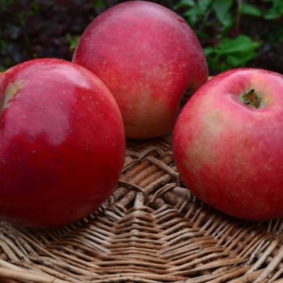 Форма плодов этого сорта правильная, круглого типа, встречаются и варианты с верхушкой-конусом. Кожа гладкая, тон кремовый, когда плод созревает, цвет становится красным, насыщенным. Вес варьируется от 140 до 160 г, хотя иногда встречаются аномально крупные яблоки – больше 200 г. Мякоть имеет сочную, плотноватую структуру, дегустационные качества отличные. Вкус соединяет сладость и кислинку, с добавлением пряных нот. Состав довольно богат на витамины и микроэлементы.
